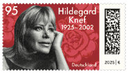 Ein weiteres Postwertzeichen (95 ct) würdigt Hildegard Knef (1925–2002) – Schauspielerin, Sängerin, Autorin und internationale Ikone. Mit Liedern wie «Für mich soll’s rote Rosen regnen» und Filmen wie «Die Sünderin» schrieb sie deutsche Kulturgeschichte. Ihre Stimme, ihr Stil und ihr Mut machten sie zu einer der schillerndsten Persönlichkeiten des 20. Jahrhunderts.