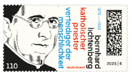 Zum 150. Geburtstag erinnert eine Sondermarke (110 ct) an den Berliner Dompropst Bernhard Lichtenberg (1875–1943). Der Priester betete öffentlich für verfolgte Juden und protestierte mutig gegen die NS-Verbrechen. Auf dem Transport ins KZ Dachau starb er an den Haftfolgen. 1996 wurde er seliggesprochen, 2004 als «Gerechter unter den Völkern» geehrt.