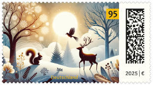 Die Sondermarke «Winterlandschaft» (95 ct) fängt die stille Magie verschneiter Natur ein – mit Wald, Tieren und sanftem Licht. Das Motiv von Grafiker Thomas Steinacker strahlt Ruhe und Frieden aus und wurde in einer internen Abstimmung der Deutschen Post als Favorit gewählt.