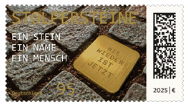 Über 116’000 «Stolpersteine» in 31 Ländern erinnern heute an die Opfer des Nationalsozialismus. Mit einer neuen Briefmarke (95 ct) würdigt die Deutsche Post das Kunstprojekt des Künstlers Gunter Demnig, das zum grössten dezentralen Mahnmal der Welt geworden ist. Jeder Stein trägt einen Namen – und steht für die unvergessene Würde eines einzelnen Menschen.