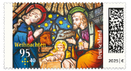Die diesjährige Weihnachtsmarke der Serie «Kirchenfenster» (95 + 40 ct) zeigt die Geburt Christi im Stall von Bethlehem – nach einem Fenster der Nicolaus-Gallus-Kapelle in Regensburg. Das Motiv erinnert daran, dass aus der einfachen Krippe Licht und Hoffnung für die Welt strahlen. Der Zuschlag von 40 ct kommt wohltätigen Zwecken zugute.