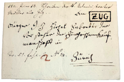 Vorphila-Brief aus der Helvetik vom 13. Januar 1802 von Zug nach Zürich, sehr sauber abgestempelt mit dem einzigen in der Helvetik bekannten Poststempel Winkler Nr. 184. Lettre préphilatélique de la République helvétique datée du 13 janvier 1802, envoyée de Zoug à Zurich, très proprement oblitérée avec le seul cachet postal connu de la République helvétique, Winkler n° 184.