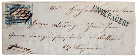 Ein unscheinbarer Beleg von Unterägeri nach Ballwil mit einer Doppelentwertung. Diese kommt wohl daher, dass der Brief am 27. Mai 1857 versandt wurde und gemäss Weisung der Post vom 23. Mai 1857 ab sofort die Verwendung von Rautenstempeln untersagt wurde. Kat. Nr. 23C / AW 30/U10 in blau. Un document imperceptible d’Unterägeri à Ballwil avec une double oblitération. Celle-ci s’explique par le fait que la lettre a été envoyée le 27 mai 1857 et que, conformément à la directive de la poste du 23 mai 1857, l’utilisation des cachets en forme de losange était désormais interdite.